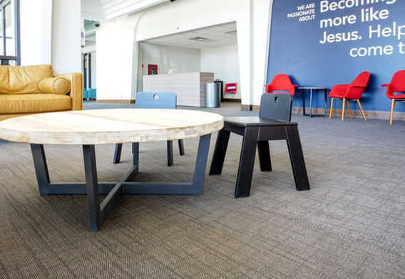 As one of the primary entrances to the sanctuary, the west foyer at Bethany First Church is an important space for creating a friendly, welcoming atmosphere—especially for visitors to the church. New finishes, flooring, railings, furniture, and light fixtures transformed the space from a bland entry foyer into a warm and inviting hospitality center.